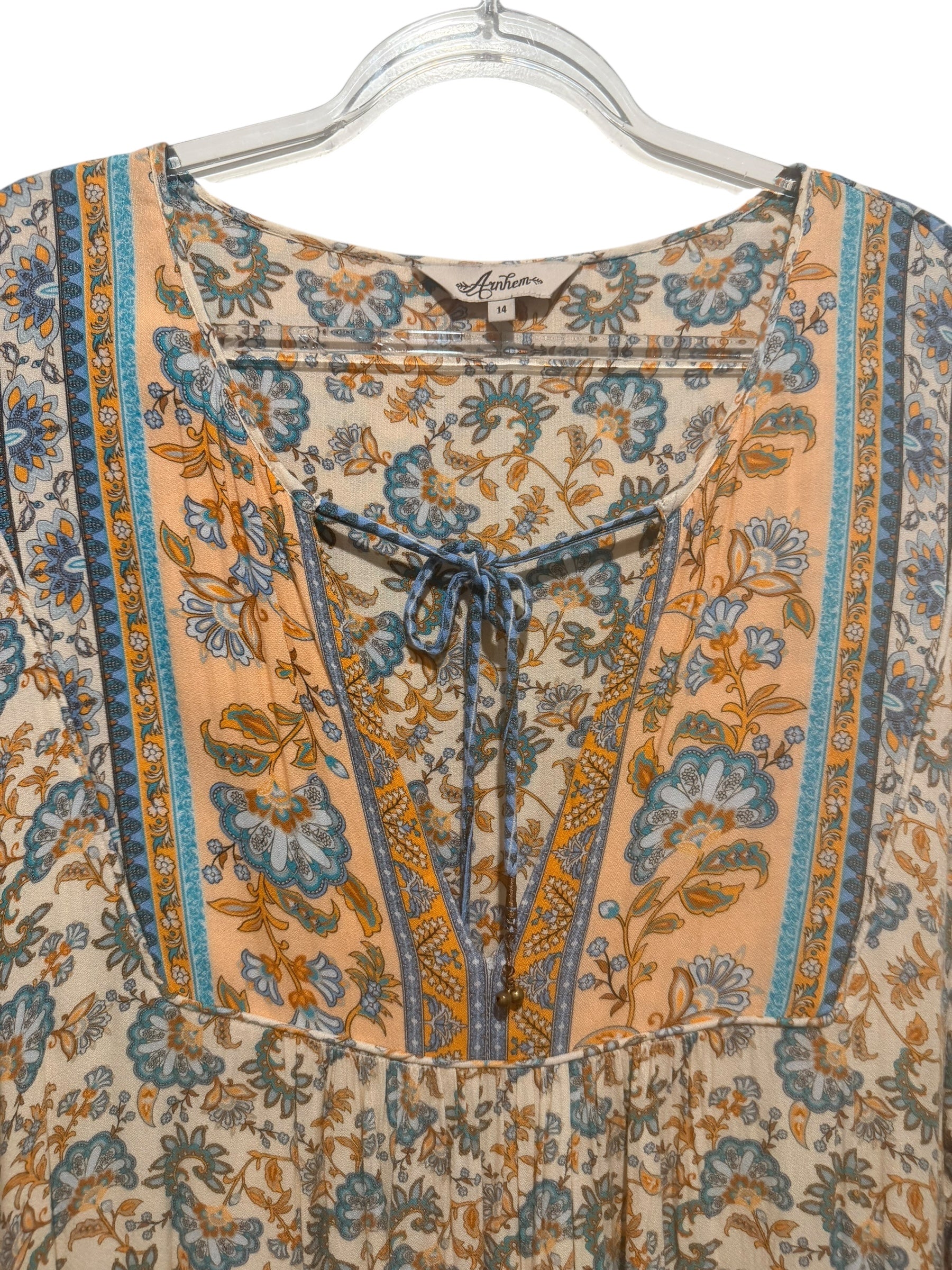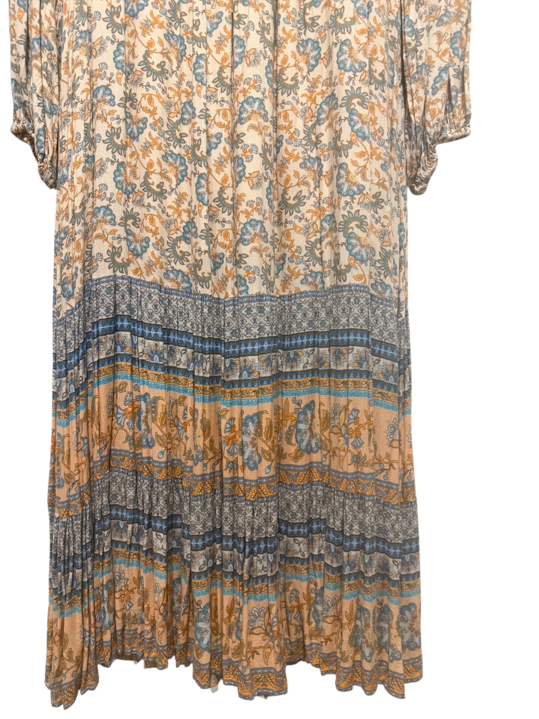 This maxi dress is button up on the bodice to the collar, cinched at the waist, with long wrap tie. The base colour is white with floral print in oranges and blues (more pastel). The dress is long but above the ankle/sitting at the shins, with some tailoring and frill towards the bottom which boasts that A_Line silhouette. These style dresses are not only super comfortable, and easy to feel great in - but they support any body style. Show some wrist or ankle, add some bangles or earrings, maybe a funky hat and your on your way! Great for Picnics, Brunch, Lunch or whatever your doing and want to feel fabulous in!