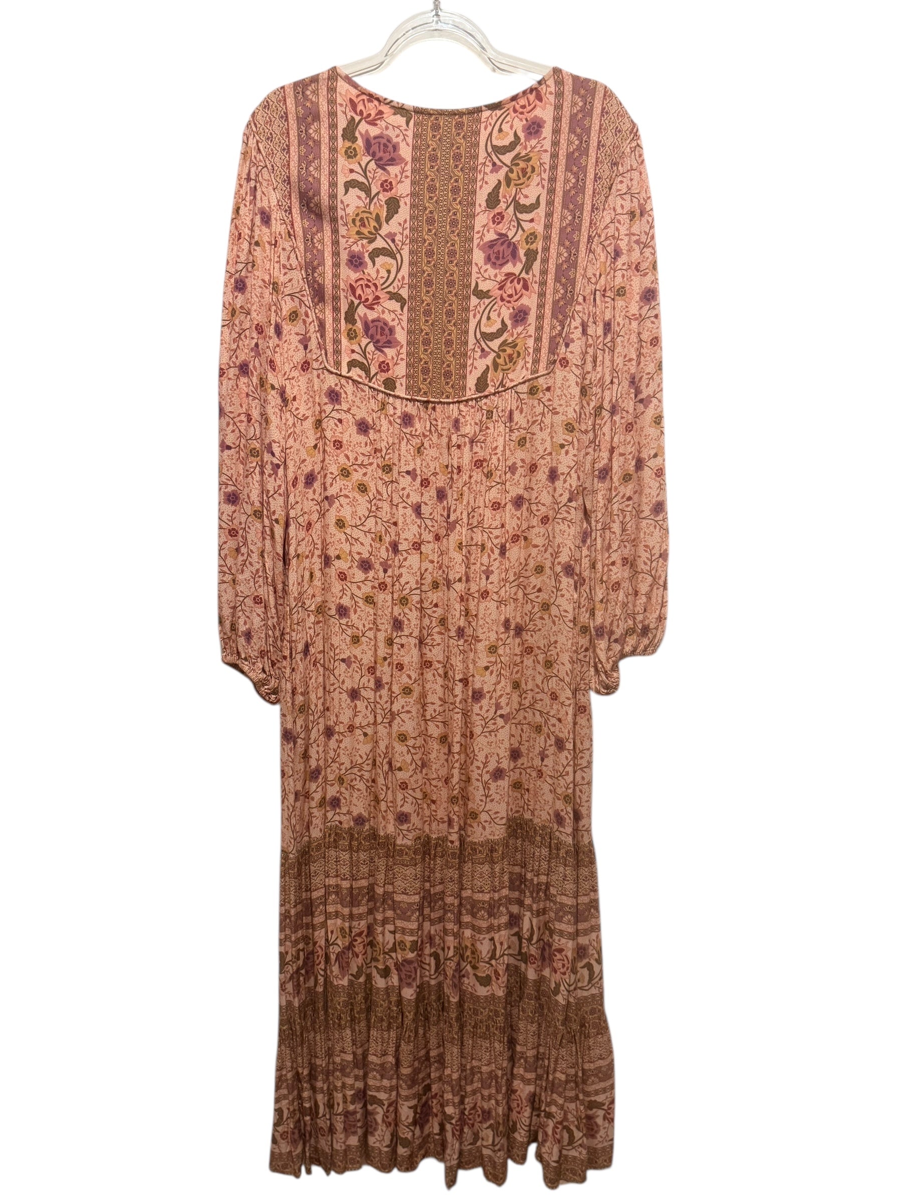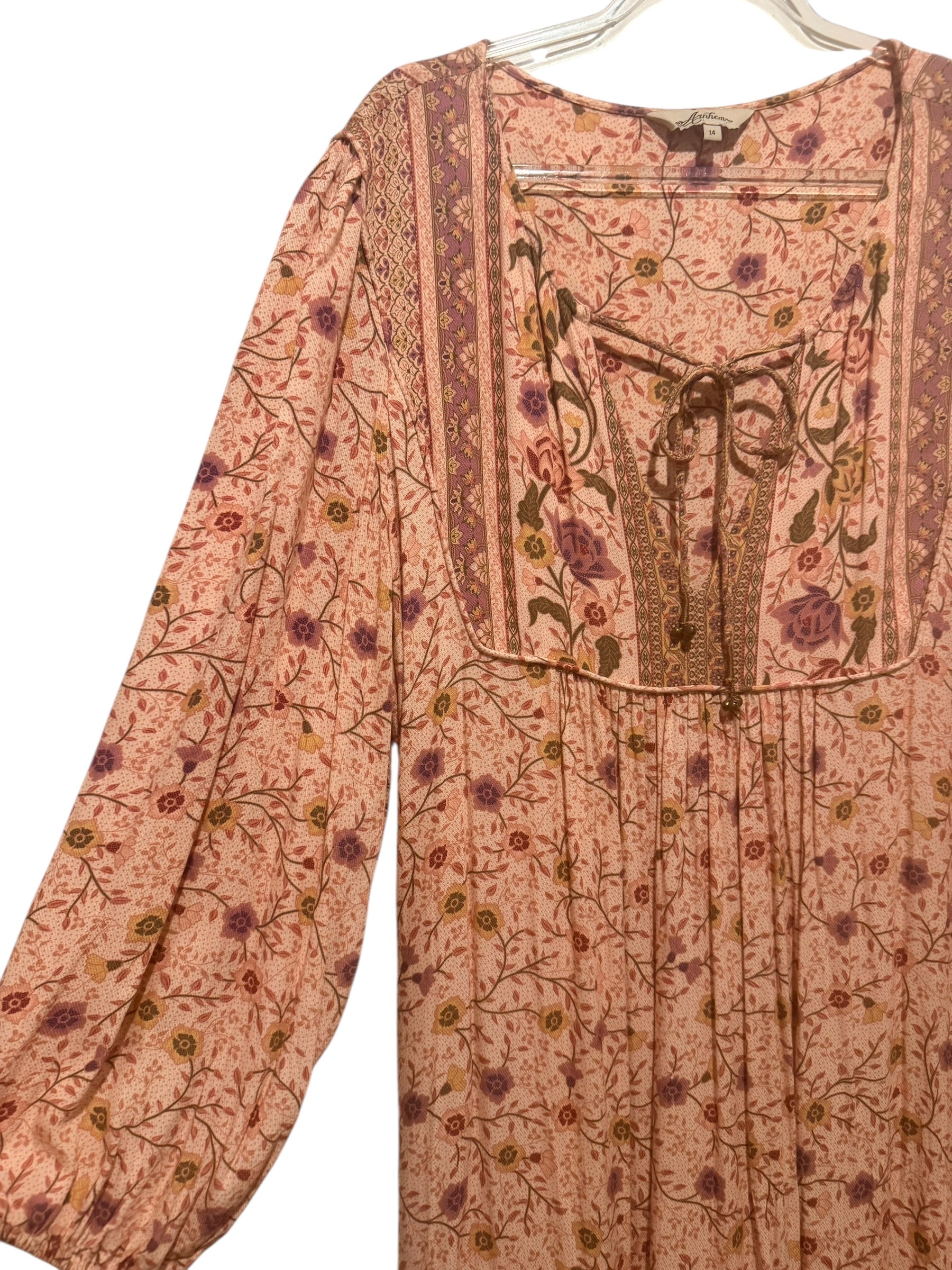This mid/maxi dress is gorgeous with its base of pastel pink with floral of purples, pinks, some browns and touch of green. The dress is long but above the ankle/sitting at the shins, with some tailoring and frill towards the bottom which boasts that A_Line silhouette. These style dresses are not only super comfortable, and easy to feel great in - but they support any body style. Show some wrist or ankle, add some bangles or earrings, maybe a funky hat and your on your way! Great for Picnics, Brunch, Lunch or whatever your doing and want to feel fabulous in!