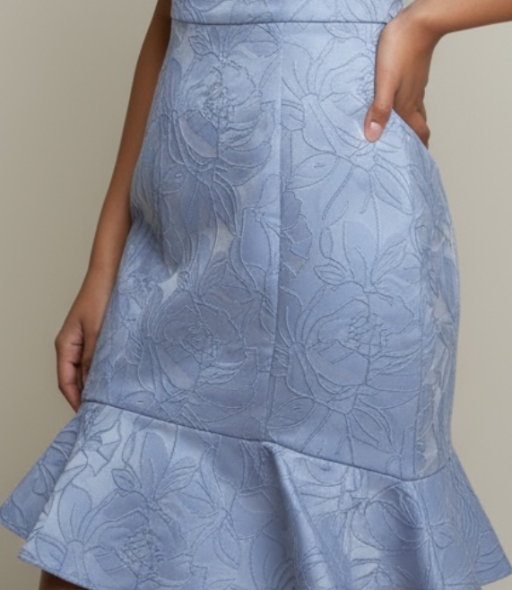 This dress is absolutley gorgeous with its jacquard style print. It is a fitted flare mini dress, which has a scoop neck and singlet style top. There is structured tailoring throughout to contour with the body, and invisible zip at the back. There is stitched lining on the inside meaning the dress will sit beautifully in place without moving up and down. This is an OMG!!