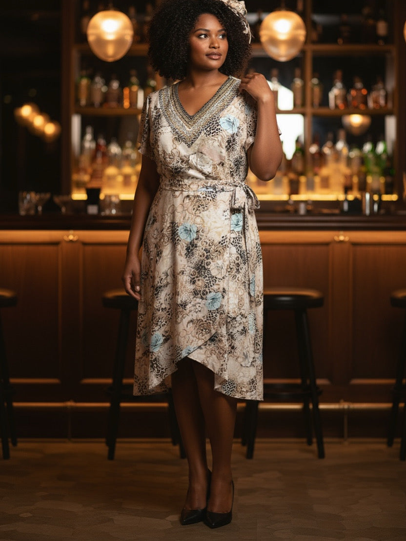 This stunner is a V-neck, hi lo dress - meaning the back hem hangs lower than the front. The beauty of this, is it creates movement and flow, giving the dress a more elevated, stylish feel. The silhouette is lengthened especially when paired with sandals or heels and offers the elegance of a long dress without feeling heavy or restrictive. It is Brand new with tag and is a gorgeous print - you will look stunning in this - no matter the event and it needs very little in accessories because the dress says it all! Instant glamour!