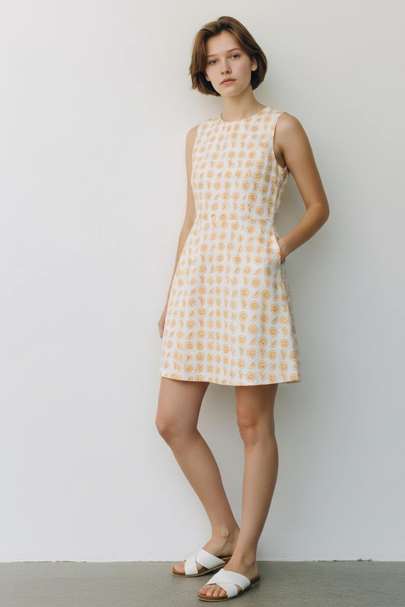 Crew neck with singlet style sleeves, invisible zip up the back. Fitted bodice cinched at the waist, into vertical tailored panelling at the skirt, from the waist down. So this is a fit & flare style, A-line silhouette. Its like this subtle little node to the retro eclectic vibe, aligned with its subtle feminine vintage style. Also - our favourite - pockets! Love love! The orange print makes us think summer brunch and champagne!