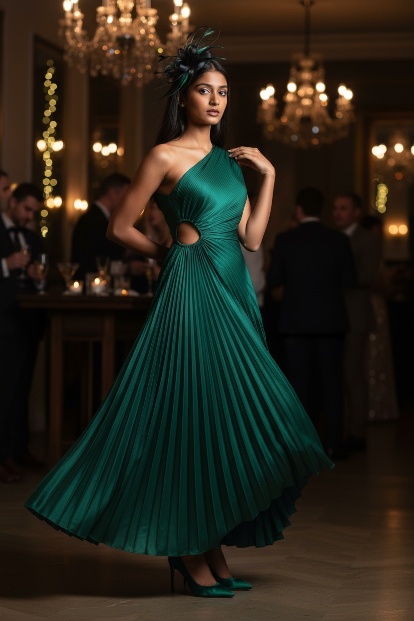 Hello Hollywood! This gown is a show stopper, and has that kind of vintage-Hollywood vibe. Featuring a one-shoulder halter-style neckline that elegantly frames the decolletage, paired with a dramatic side cut-out at the waist. The emerald green is a satin/metallic finish and pleated all the way through. The fitted bodice balances the volume of the skirt, giving a cinched hourglass effect. A beautiful and elegant statement piece.