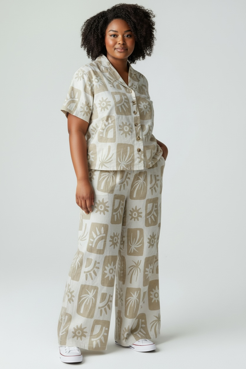 This cozy two-piece set features a short-sleeve button-up shirt paired with wide-leg pants in a soft beige and cream palette. The fabric displays a geometric pattern of stylized suns and palm trees, giving it a tropical, retro vibe that's both playful and relaxing. It's perfect for lounging at home or warm-weather sleepwear, with a relaxed fit for ultimate comfort.