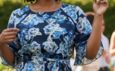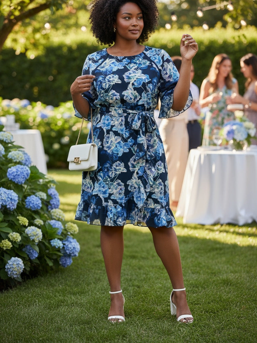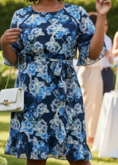 So gorgeous - this blue floral dress is about knee length, and elasticised/cinched at the waist, with a gorgeous matching blue tie/belt to go over the top. This creates some additional detailing to this beautiful style and print. The short butterfly sleeves move into a round neck and have lining which add to the structure and style. Very flattering, very gorgeous, very one of our faves!