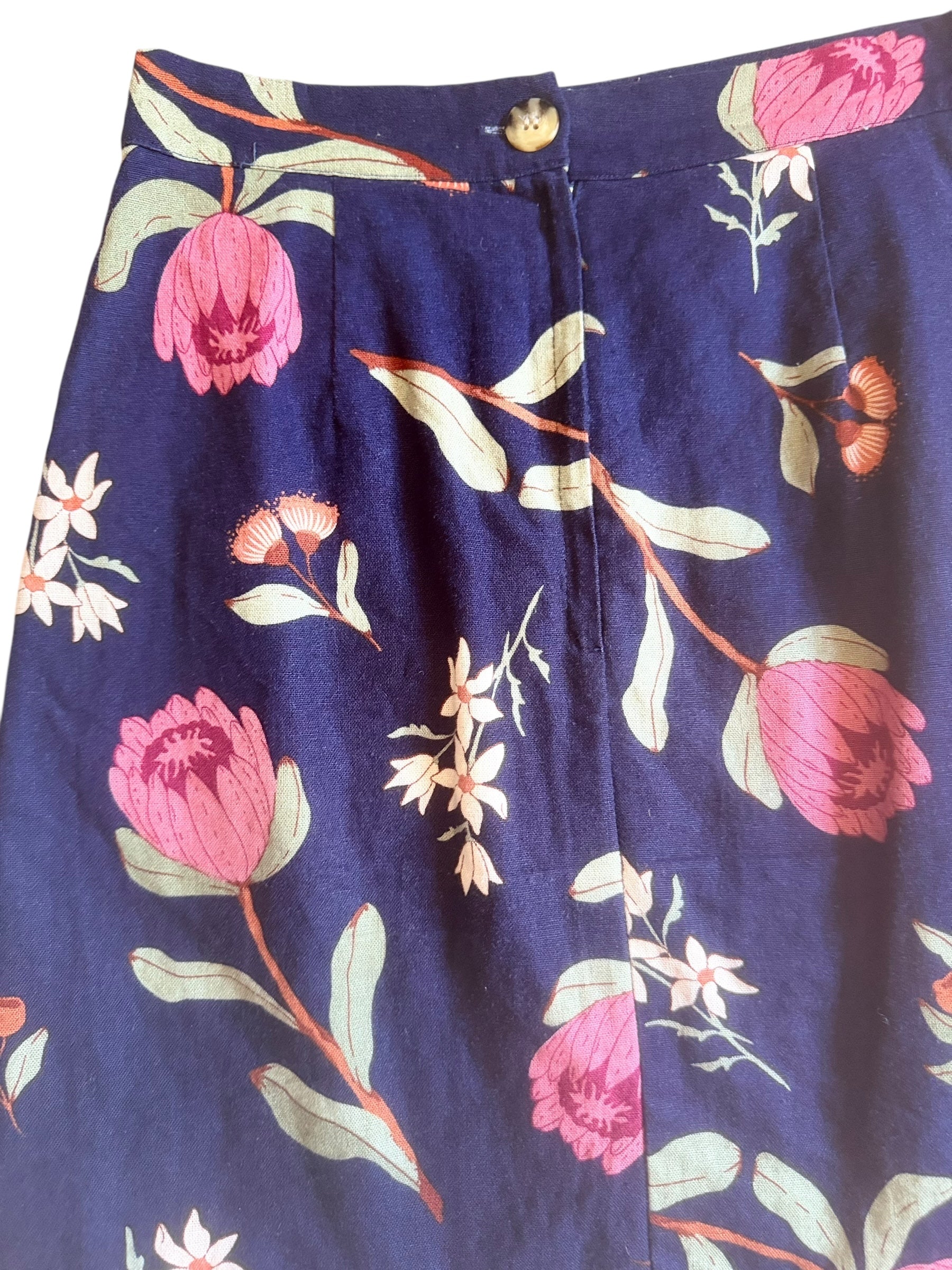 Love love love! This skirt is a fab edition to your wardrobe, we would totally pair with some neutral brown wedges, ballet flats, sandals, ankle boots - take your pick? A fitted top with an oversized jacket or blazer would also look great. Its a navy blue base with a floral print and so breathable - cos Linen! We have pockets and high waist and a flattering silhouette for all bodies. Yes yes!