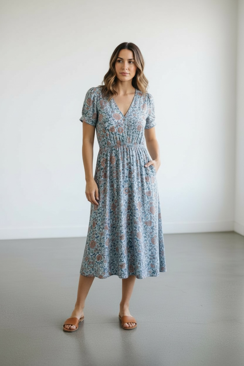 Oh cute! Breezy and beautiful this midi dress is a base blue v-neck, with floral print colours of orange and peach. Cute short puff sleeves, cinching at the waist with a shirred effect flowing into a twirl-worthy skirt. Such a great thrown on for an effortless summer style.